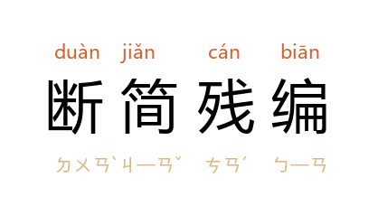 断、残:不完整的;简:古代用以写字的竹、木片;编:细长皮条;指用它串简而成的书。残缺不全的书或文章;尤指古代的书籍。