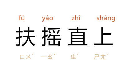 扶摇:迅猛盘旋而上的旋风。乘着大旋风之势一直上升。比喻事物迅速地直线上升。有时也比喻官职提升得很快。