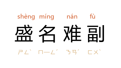 盛:大;副:相称,符合。名望很大的人,实际的才德常是很难跟名声相符。指名声常常可能大于实际。用来表示谦虚或自我警戒。