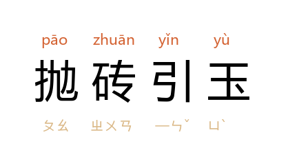 抛出砖头;引来白玉。比喻用粗浅的、不成熟的意见或文章;引出别人高明的、或熟的意见或作品。常用作谦词。