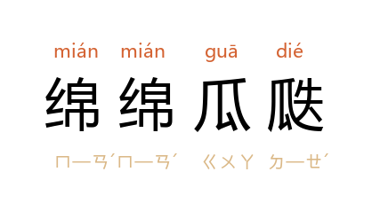 绵绵:延续不断的样子;瓞:小瓜。如同一根连绵不断的藤上结了许多大大小小的瓜一样。引用为祝颂子孙昌盛。