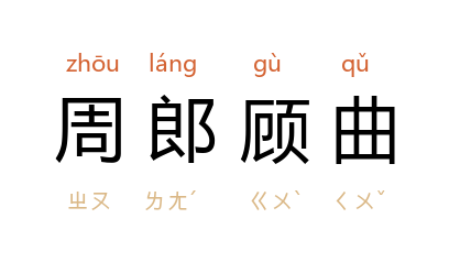 出处《三国志·吴书·周瑜传》:“瑜少精意于音乐,虽三爵之后,其有阙误,瑜必知之,知之必顾,故时有人谣曰:‘曲有误,周郎顾。’”