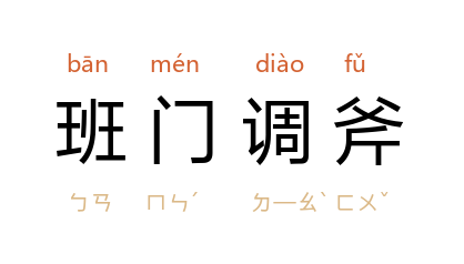 班:鲁班,春秋时期鲁国人,著名的木匠;调:耍弄。在鲁班门前舞弄斧子。比喻在行家面前卖弄本领,不自量力。