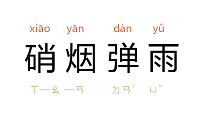 硝烟:爆炸后产生的烟雾,指战争;弹:子弹。硝烟浓密,子弹如雨。形容战场炮火非常激烈。