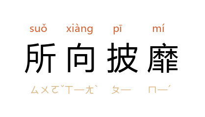 风所吹到的地方;草木全被吹倒。比喻力量所达到的地方;一切障碍全被扫除。所向:指风吹到的地方;靡:音米;披靡:草木被吹倒。