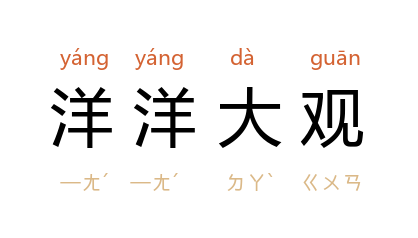洋洋:盛大、众多的样子;大观:丰富多彩的景象。形容事物繁多;丰富多彩;气象宏大;非常可观。
