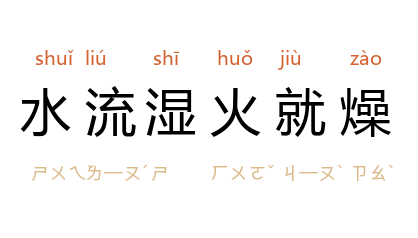出处《易 乾》:“水流湿,火就燥,云从龙,风从虎……各从其类也。”孔颖达疏:“此二者以形象相感。水流於地,先就湿处;火焚其薪,先就燥处。”