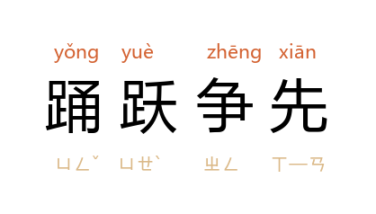 踊跃:欢欣奋起的样子。积极争着赶在前头,不甘落后。