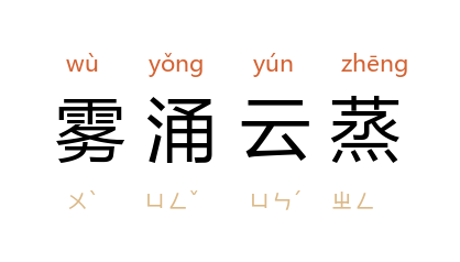 出处南朝·梁·刘孝标《广绝交论》:“故絪緼相感,雾涌云蒸。”元·王王恽《游泰山杂诗》之六:“绾茁元气同沧海,雾涌云蒸一水山。”