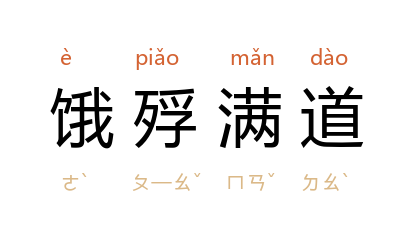 殍:饿死的人。满路都是因饥饿而死的人的尸体。形容饥荒灾祸严重,人民大量死于饥寒的惨状。