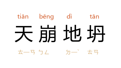 出处茅盾《参孙的复仇》:“立时天崩地坍一阵响,整个大殿倒塌。”