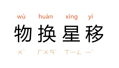 物换:景物改变;星移:星晨的位置移动。景物改变;星辰位置移动;指时序变迁。