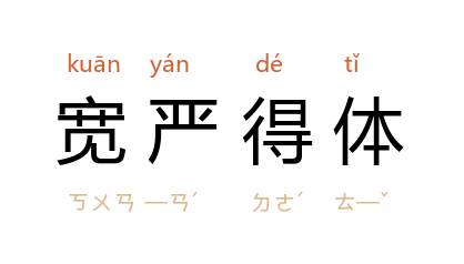 得体:合乎分寸。宽厚和严格掌握得恰如其分。