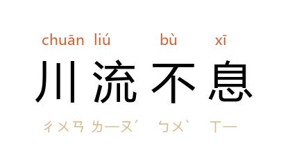 川:河流;流:流动;息:停止。①比喻时光的流逝和大自然的运行永无休止。②亦形容行人、车马、船只等往来不绝。