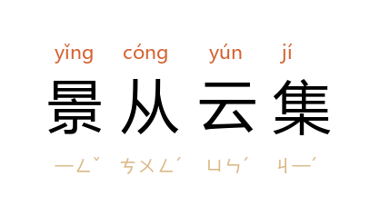 景:同“影”。如影随形,如云聚集。形容很快聚集了许多追逐者。