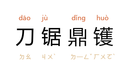刀、锯:古刑具,也指割刑和刖刑;鼎镬:古炊具,也指烹刑。指古代刑具。也泛指各种酷刑。