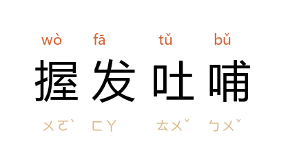 出处《韩诗外传》卷三:“成王封伯禽于鲁,周公诫之曰:‘往矣!子其无以鲁国骄士。吾文王之子,武王之弟,成王之叔父也,又相天下,吾于天下亦不轻矣,然一沐三握发,一饭三吐哺,犹恐失天下之士。’”《史记·鲁周公世家》亦记此事。