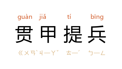 贯:穿;甲:盔甲;兵:武器。身穿盔甲,手提武器。形容杀气腾腾的样子。