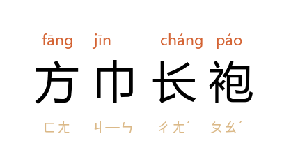 方形头巾,长袍子。古代儒生的装束。指儒生
