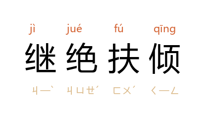 继:延续;扶:扶助,扶持。把断绝的接续上,把倾倒的扶起来。比喻继续前人未完的功业,扶助弱小的力量。