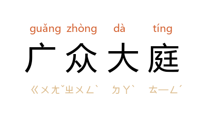 广:多;众:许多人;大庭:宽大的场所。指聚集很多人的公开场合。