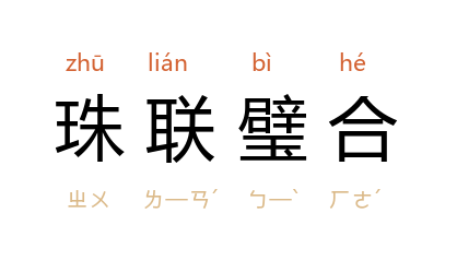珍珠联成串;美玉合成双。比喻美好的事物。人才聚合在一起。璧:中间有孔的扁圆玉器。