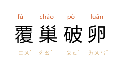 覆:翻;破:打破。翻倒鸟窝,破碎鸟蛋。比喻毁灭性的打击降临于众时,无一可以幸免。