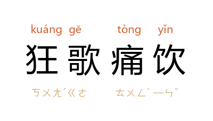 狂:越出常度;痛:痛快,尽情。欢畅饮酒,纵情唱歌。形容喜悦的心情。