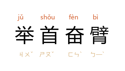 举:抬起;奋臂:有力地高举手臂。形容精神奋发。