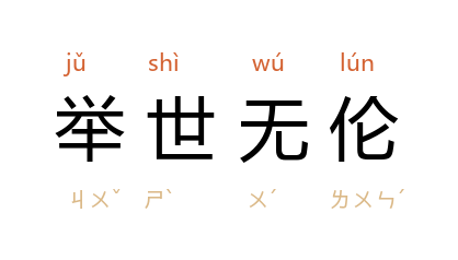 举:全,皆;举世:全世界;伦:类,同类。整个人世间没有比类的。形容稀有少见或无与伦比。