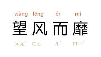 出处《汉书·杜周传》:“天下莫不望风而靡,自尚书近臣皆结舌杜口,骨肉亲属莫不股栗。”唐·陈子昂《堂弟孜墓志铭》:“是以乡里长幼,望风而靡;邦国贤豪,闻名而悦服。”