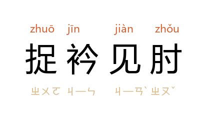 《庄子·让王》:“曾子居卫,十年不制衣,正冠而缨绝,捉衿而肘见。”衿,同“襟”。谓整一整衣襟就露出了肘子。后以“捉衿见肘”形容衣衫褴褛。引申为顾此失彼,处境困难。
