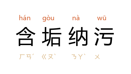 垢、污:脏垢;污秽。心里忍受着羞耻和污辱。本指国君应当有容忍耻辱和诬枉的气度。后指有容忍耻辱的度量;也转用以形容秽恶聚集之处;或包容坏人坏事。