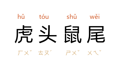头大如虎,尾细如老鼠。比喻做事起始时声势很大,后来劲头很小,有始无终。