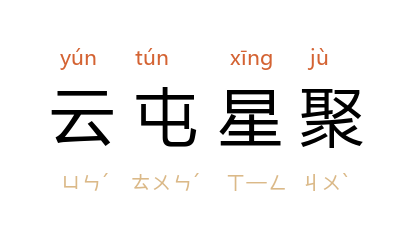 出处明·邵璨《香囊记·败兀》:“丘爷爷手下猛将如虎,战士如蜂,云屯星聚,布满四方津要去处。”