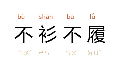 衫:上衣;履:鞋子。不着上衣;不穿鞋子;衣着不整齐。引申指居住条件或饮食设备简陋。也比喻洒脱;疏放;毫无拘束之态。多指人的举止或诗文、字画的风格。