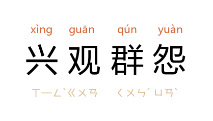 兴:联想;观:观察;群:合群;怨:怨恨。古人认为读《诗经》可以培养人的四种能力。后泛指诗的社会功能。