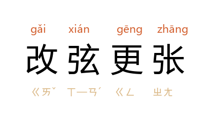 换了琴弦;重新安上。比喻变更方针、计划、办法或态度。更:改换。张:给乐器上弦。