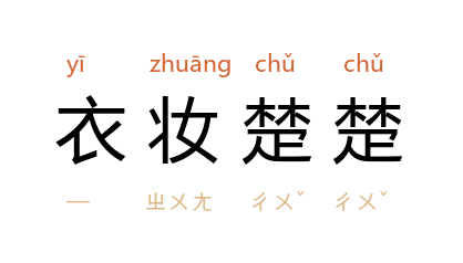 楚楚:整洁,鲜明。衣帽穿戴得很整齐,很漂亮。