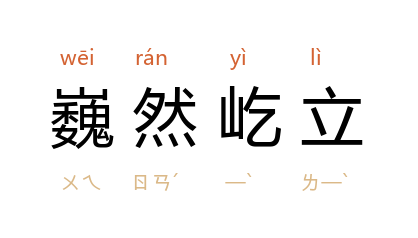 巍然:极高的样子;屹立:山势直立高耸。比喻象高山一样直立地上,不可动摇。