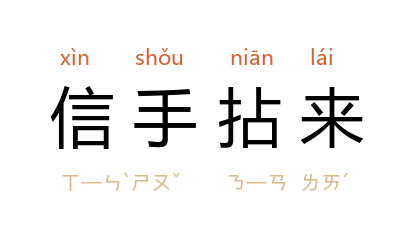 随手拿来。多形容说话写文章时词汇或材料例证丰富;选用时显得轻松自如;不必费心寻找。信手:随手;拈:用指头夹取东西。