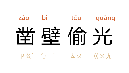 出处晋 葛洪《西京杂记》第二卷:“匡衡字稚圭,勤学而无烛,邻舍有烛而不逮,衡乃穿壁引其光,以书映光而读之。”