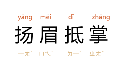 抵掌:双掌合在一起。扬起眉毛,双掌合在一起。非常喜悦、珍惜的神态。