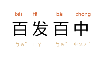 百:形容多;发:发射;也指射箭;中:正对上;恰恰合上。①指射箭技术高明;每次都能命中目标。②比喻料事准确;算计高明或做事有充分把握;绝不落空。