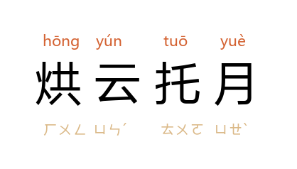 烘;渲染;托:衬托 。原指作画时渲染云彩来衬托月亮。比喻不从正面描绘;而从侧面点染以烘托突出主要事物。