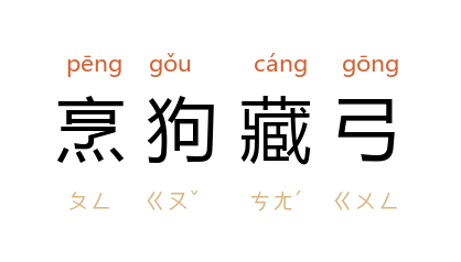 语出《史记·越王勾践世家》:“范蠡遂去,自齐遗大夫种(文种)书曰:‘蜚鸟尽,良弓藏,狡兔死,走狗烹。’”后以“烹狗藏弓”比喻事成之后把效劳出力的人抛弃以至杀害。