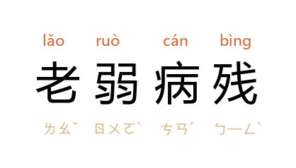 老:老人;弱:弱小的幼童;病:病人;残:残疾人。泛指弱势群体。