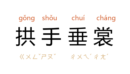 拱手:两手合抱在胸前;垂:垂衣裳。两手合抱在胸前端坐。形容统治者不做什么便使天下太平。