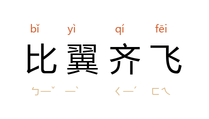 比翼:翅膀挨着翅膀。齐飞:成双的并飞。比喻夫妻情投意合,在事业上并肩前进。