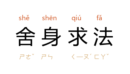 舍身:舍弃身体;求法:寻求佛法。原指佛教徒不惜牺牲自己,远道求经。后比喻为了追求真理而不惜牺牲自己。